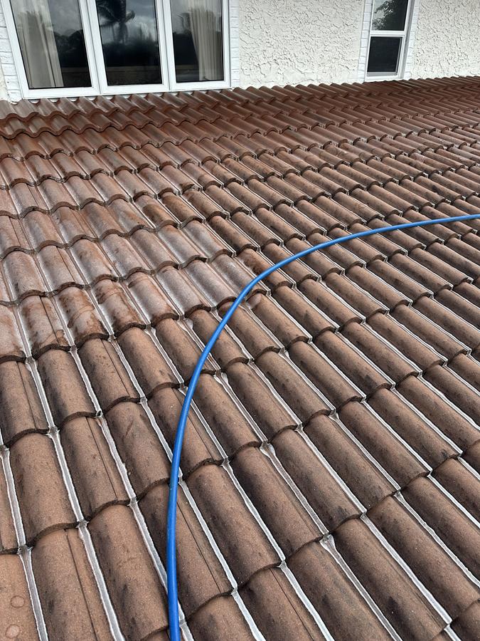 Perfect two story home roof soft wash cleaning in port Salerno, Stuart Florida.