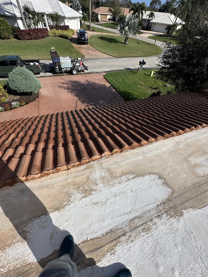 This beautiful two story home had an abundance of landscaping that needed to be protected throughout my roof cleaning soft wash process. After speaking with my client, and confirming that we were on the same page with the process and result expected, I added them onto my schedule for the following week. On the day of the project, me and a helper arrive on site a little later than planned because of unforeseen circumstances. Nonetheless, I still planned out to have plenty of time in order to complete the project to the best of my abilities. It all starts with attaching my water intake hose to the clients home and begin filling my water buffer tank to have plenty of water in flow to keep vegetation, wet and alive. While that is getting filled up, I preform a property walk around/inspection to make sure there are no open electrical receptacles, open windows, wood materials and etc. once everything seems to be in place, I then find a safe spot for my ladder and me to set up an entrance and exit point for the roof. My helper begins wetting everything down from walls to windows to plants and everything in between nonstop for the duration of the project. After several minutes of wetting everything down and priming my 7 gallon per minute 12 V roof pump system with a powerful 6 to 7% cleaning solution, I climb onto the roof and first clean out the gutter along the top of the pool which my client had specifically asked for. Upon arrival to the gutter over the pool, I noticed it is completely flooded with roof tile granules from the previous company that decided to use a pressure method to blast off all of the organic material along with much of the roof material. Unavoidably, that process made a bit of a mess, but I had the extra time to make sure everything was clean. Still while my colleague continued to wet and clean everything I began to apply cleaning solution the walls of the pool area since we agreed to clean up the black streaks around the porch walls. My colleague worked on cleaning up everything in the pool area and keeping everything wet while I began applying soap to the back side of the houses roof. I continued to apply cleaning solution to the roof working my way from the back wall to the second story by bringing my ladder with me to the first roof, then onto the second story with only my spray wand. After completing the second story, I came back down the same way. I went up and moved my operation to the side of the house, where I continued to work counterclockwise onto the front to the right side of the house. In all of this, I drank water, made sure my ground guy had everything while saturated, cleaned a few odds and ends here and there, and ultimately the roof looked brand new again. Most houses in South Florida become dirty within six months to a year. After two years, most houses look horrifying. That seems to be the case for beautiful stuart Florida located on the south east coast; about 30 minutes north of Jupiter Island. This home is also on the schedule for an exterior window cleaning as well as a house wash in April. Very excited to work with wonderful clients.